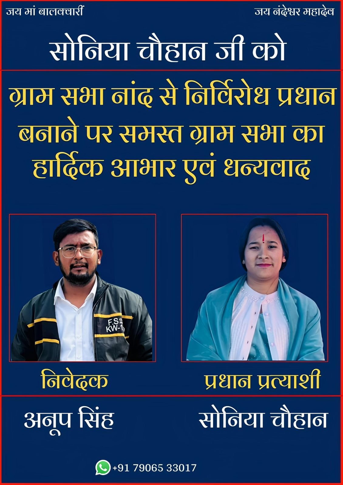 सोनिया चौहान की इस जीत को गांव में एकता और सहयोग का प्रतीक माना जा रहा है। निर्विरोध निर्वाचन के बाद उन्होंने समस्त ग्रामवासियों का आभार व्यक्त करते हुए कहा कि यह न केवल उनके लिए सम्मान की बात है, बल्कि एक बड़ी जिम्मेदारी भी है।