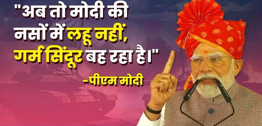 पीएम मोदी ने राजस्थान में कहा कि पवित्र सिंदूर को मिटाने का प्रयास करने वालों को धूल में मिला दिया गया है और जिन्होंने भारत का खून बहाया है, उन्हें अब इसकी पूरी कीमत चुकानी पड़ी है। पीएम मोदी ने कहा कि जो लोग मानते थे कि भारत चुप रहेगा, वे अब छिप गए हैं, जबकि जो लोग अपने हथियारों के बारे में शेखी बघारते थे, वे अब मलबे के नीचे दबे पड़े हैं।